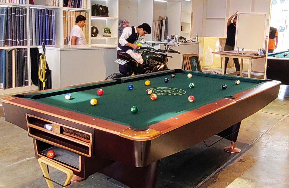 كما يحرص فني تركيب طاولات بلياردو بالرياض على شد القماش بطريقة احترافية تمنع التموجات وتحافظ على سرعة وانسيابية حركة الكرات. هذه الخطوات مجتمعة تضمن أن تركيب طاولة بلياردو يتم بأعلى جودة ممكنة، سواء للاستخدام المنزلي أو التجاري.